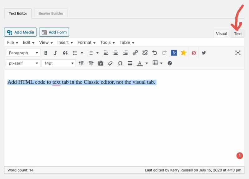 But if for some reason you do, it’s important to note that the code won’t work if you add it to the visual tab of the editor…